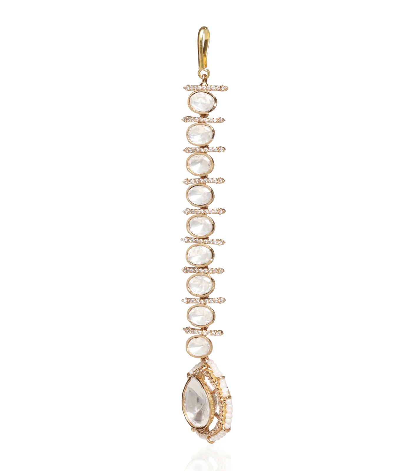 Elevate your elegance with our exquisite Mangtika, featuring large Kundan pieces gracefully plated in gold, accentuated by a delicate border of tiny pearls. A timeless blend of tradition and sophistication for a truly enchanting look.