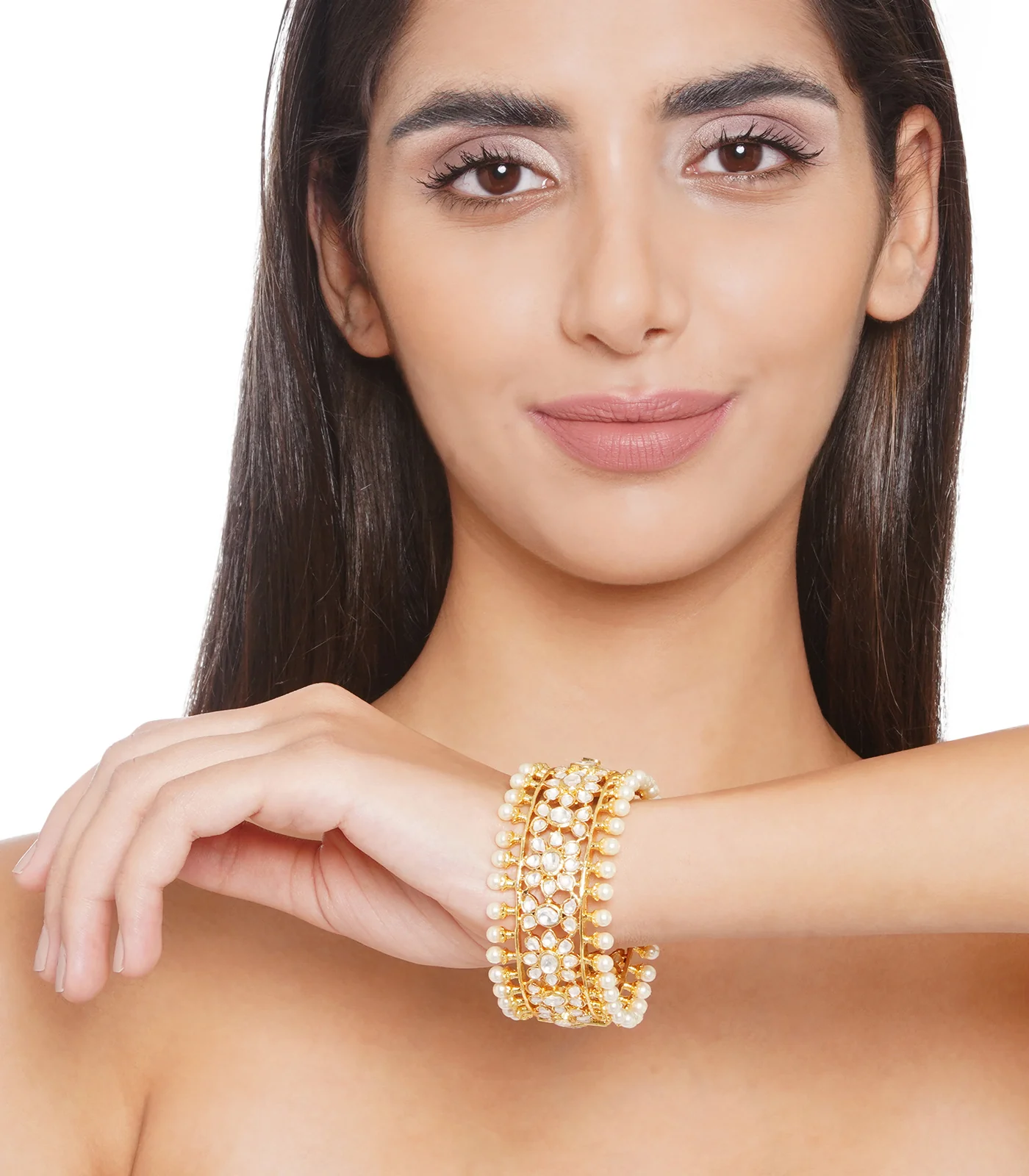 Indulge in ageless elegance with our Kundan Stone Bangle. The gold finish and exquisite Kundan stones, delicately outlined by pearls, make for a pair that exudes sophistication and grace.